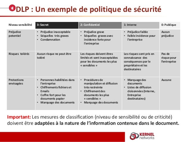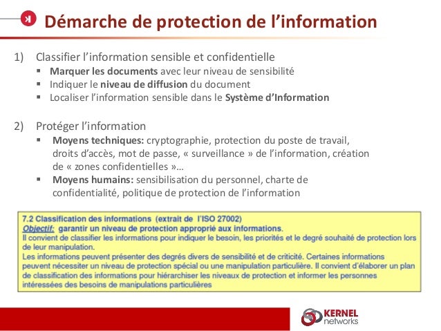 ROSI : responsable organisationnel de la sécurité de l¶information. Mettre en place une politique de classification de l’information définissant plusieurs niveaux et imposant un marquage des documents et des e-mails contenant des données confidentielles. Porter une mention visible et explicite sur chaque page des documents papiers ou électroniques qui contiennent des données sensibles2.